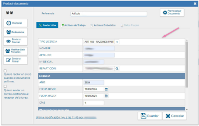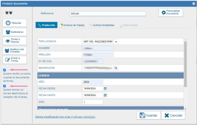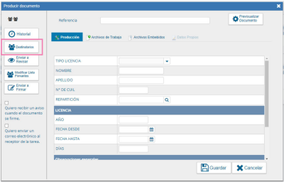 Una vez abierta la ventana del formulario, hacer clic en la opción Destinatarios para definir la persona a la cual va dirigida la nota, en este caso, será la Unidad de Registro (UR) correspondiente a la repartición de revista del agente que solicita la licencia.