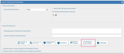 Se abrirá una ventana, donde deberá buscar el formulario FSOLI Solicitud de licencias. Una vez seleccionado correctamente, hacer clic en el botón Producirlo yo mismo.