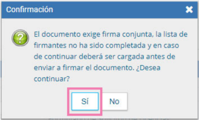 Importante: En caso de aparecer un aviso de confirmación, no agregar usuarios verificadores. Hacer clic en la opción No.
