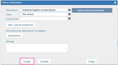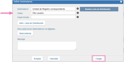 • Después de seleccionar los destinatarios, seleccionar la opción Cargar. • Finalmente, hacer clic en Aceptar.