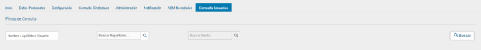 Para realizar una consulta sobre los usuarios dados de alta en el sistema se podrá acceder a la solapa Consulta Usuario y mediante las búsquedas propuestas, por nombre o apellido o por sector o repartición se podrán localizar usuarios. Además, presionando el botón “Ver Supervisados” se podrán visualizar los usuarios supervisados del usuario logueado.