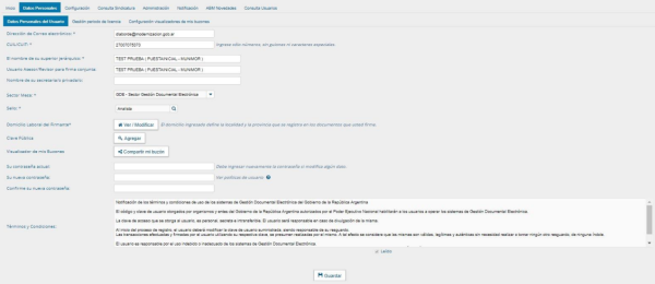 - Términos y Condiciones: se especifican las políticas de uso del sistema. Las mismas deberán leerse y tildar el checkbox “Leído”.