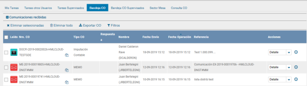 Una vez que comience el período de licencia, el usuario apoderado recibirá en su “Bandeja CO” todas las comunicaciones dirigidas al agente que lo ha designado. Las mismas se distinguen de las CO propias porque se identifican con un ícono similar a un maletín de fondo en color turquesa, como se ve a continuación: