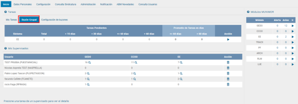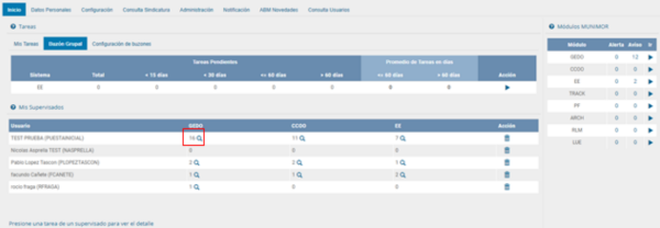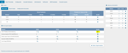 La columna “Acción” del detalle permite el acceso directo al buzón de tareas correspondiente al módulo en supervisión del personal a cargo.