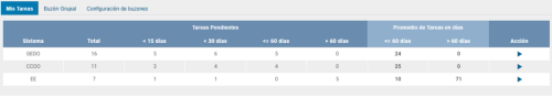 Si se presiona en la lupa situada junto al número de tareas pendientes, se puede acceder al detalle de las mismas organizadas según la cantidad de días definidos en la “Configuración de Antigüedad de Tareas”.