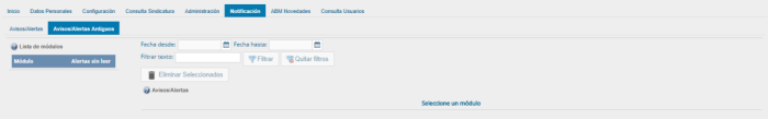 En esta pantalla se podrán consultar alertas o avisos antiguos de los módulos sobre los que se hayan generado anteriormente.