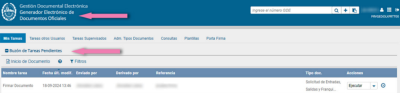 Se visualizará el documento a firmar en el buzón de tareas pendientes del módulo GEDO. Para ejecutar la firma se procederá a hacer click en el ícono en la fila correspondiente a la tarea Firmar Documento de la solicitud de licencia que acabamos de producir y el sistema nos redirigirá a la ventana Firma de Documento.